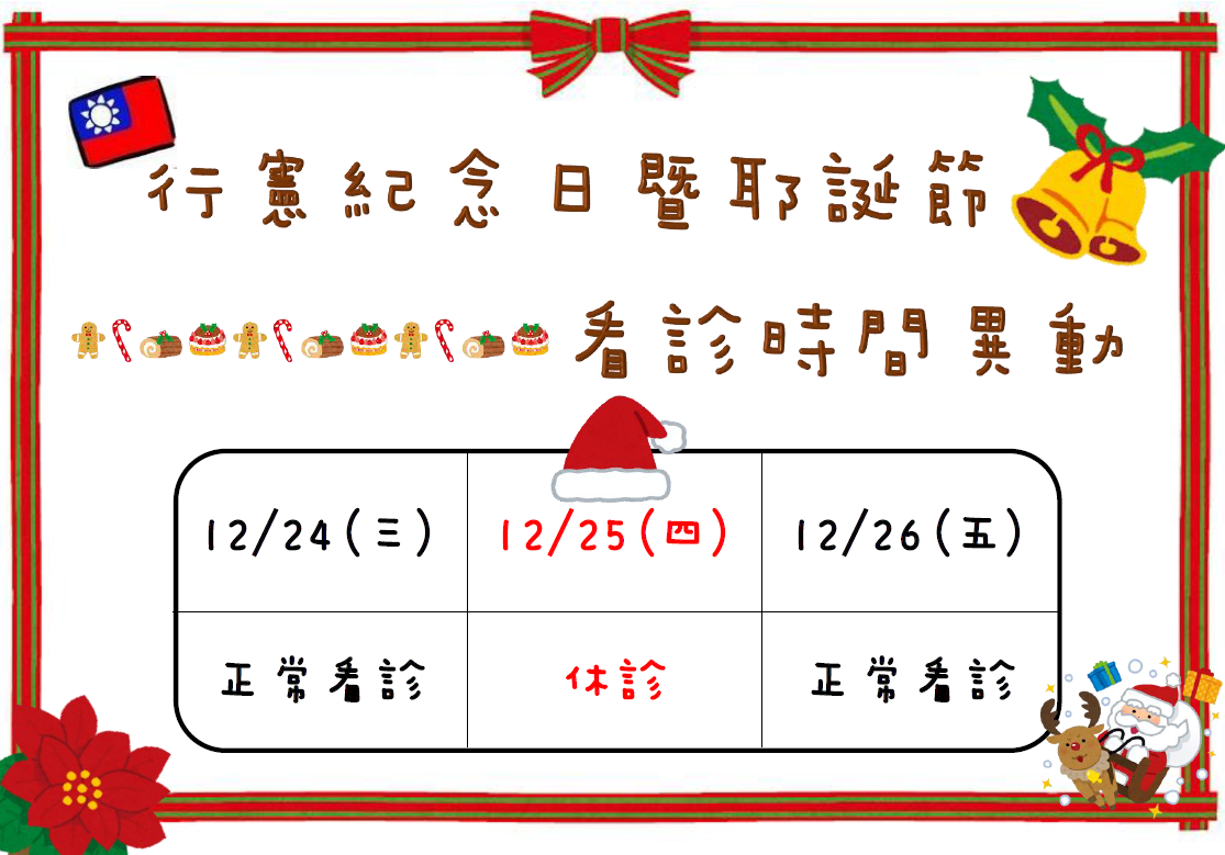 行憲紀念日、元旦休診時間